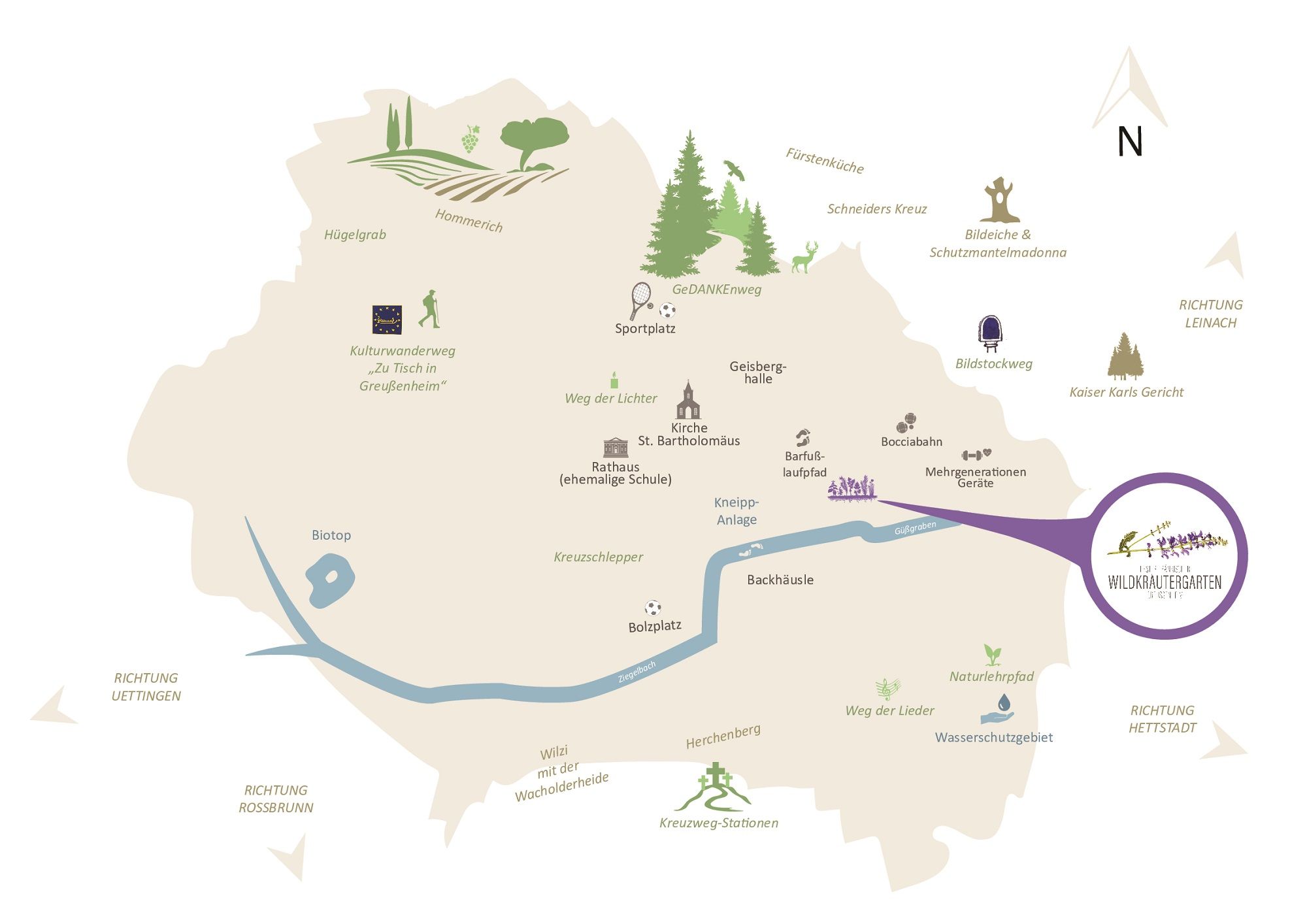 Stolz präsentieren dir die Greußenheimer ihren Wildkräutergarten, der hier - inmitten der Freizeitanlage beim Süßen Brünnle - eine weitere Bereicherung unseres Ortes ist: